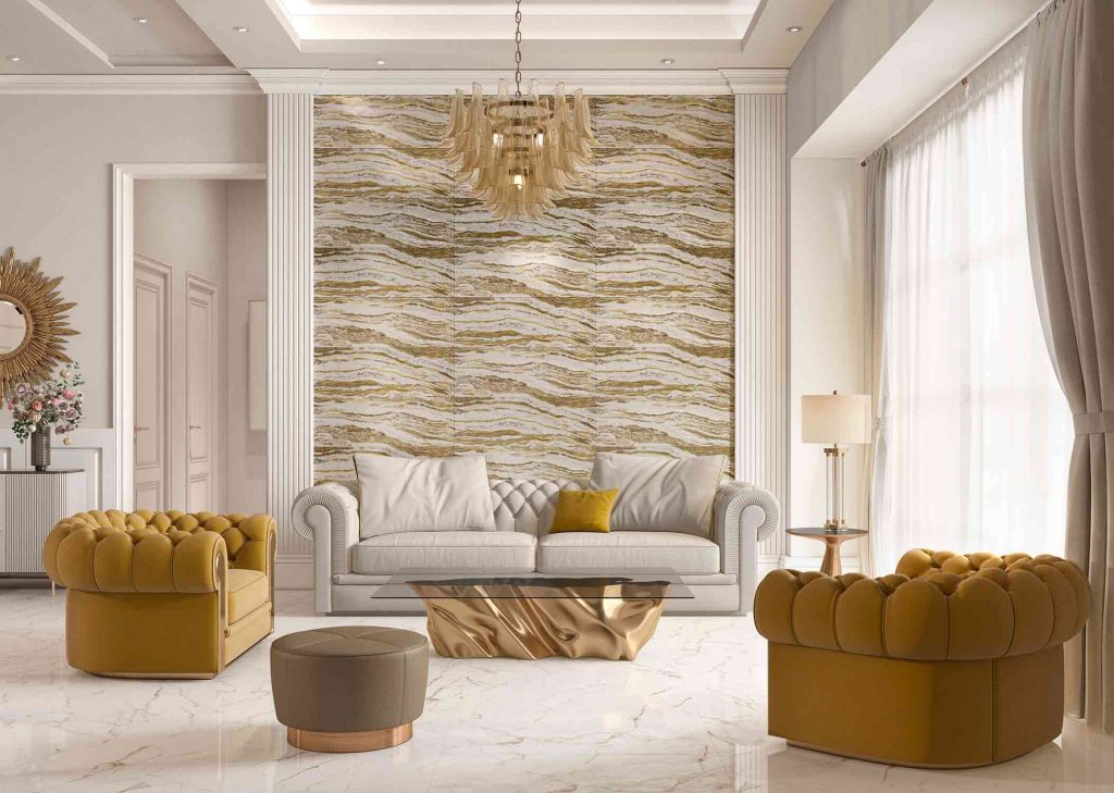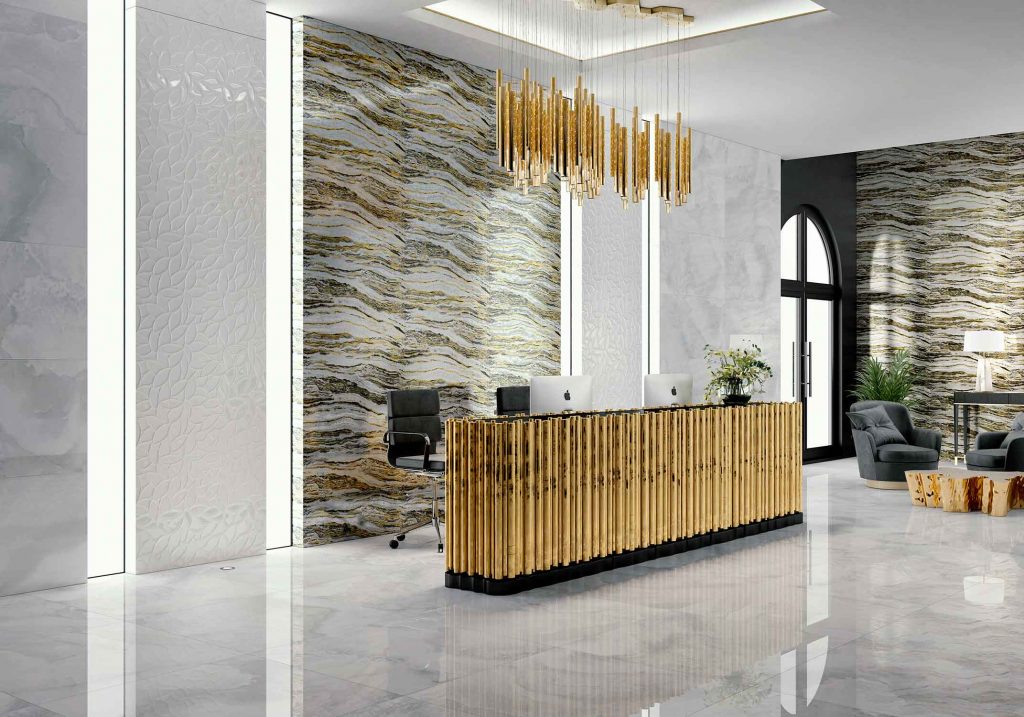 Decoration inspired by nature, a reinterpretation of natural marble enriched with flecks of gold and touches of light, ideal for luxurious and modern settings. We bet on the fourth fire, increasing the effect of precious materials, silky enamels and pure gold and glass pastes, combining them for an extraordinary result.